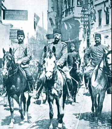 جيشه للقضاء على حكم السلطان عبد الحميد ودخل قصر يلدز ، فعزز دور